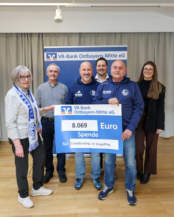 Große Erleichterung bei den Blau-Weißen: In den Räumlichkeiten der VR Bank Ostbayern Mitte nahm der FC Dingolfing in der vergangenen Woche den symbolischen Scheck aus der erfolgreichen Crowdfunding-Aktion zur Finanzierung des Hallenspektakel-Kunstrasens entgegen. Insgesamt kamen 8.069 Euro zusammen – das anvisierte Ziel wurde damit erreicht.